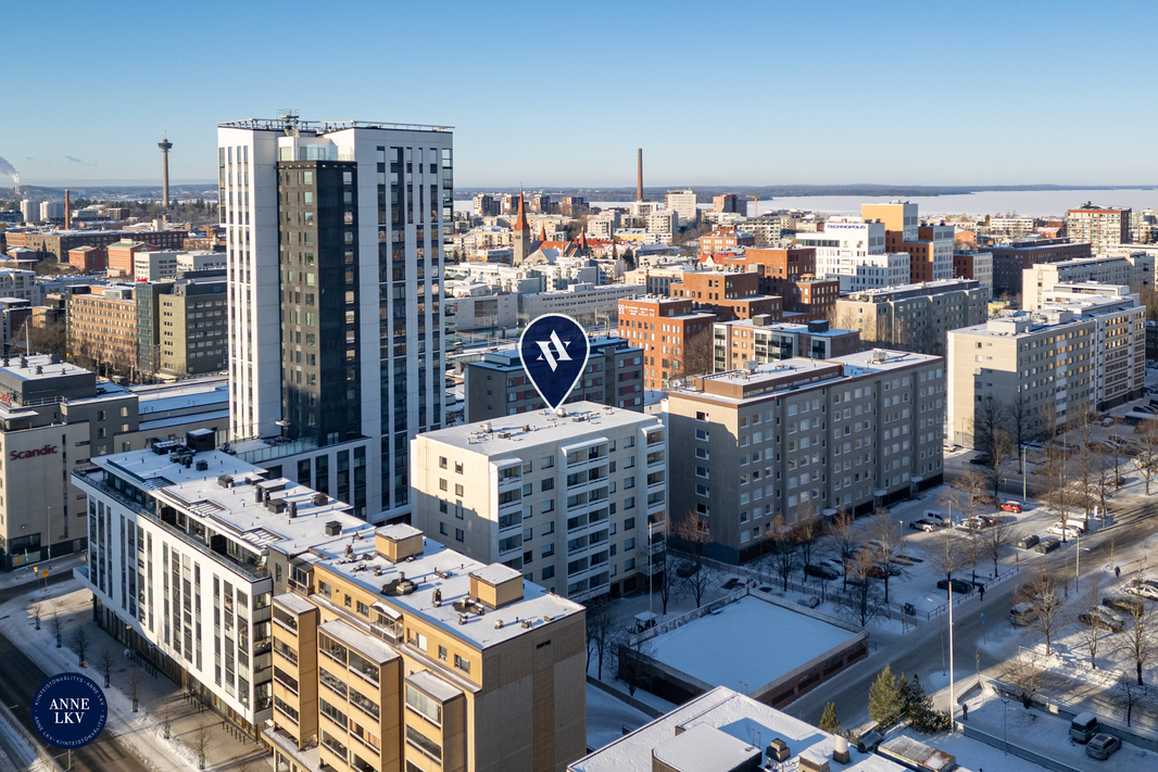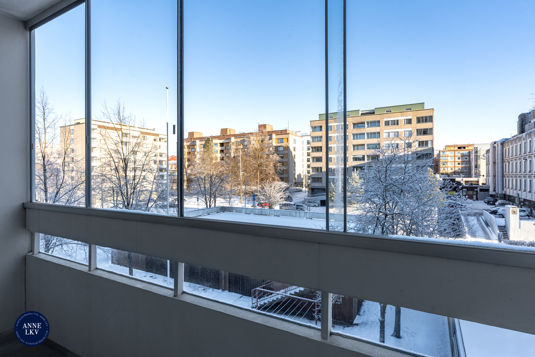 Keskeisellä sijainnilla avarin näkymin 3. kerroksen kulmahuoneisto. Asunnon pohjaratkaisu on kerrassaan verraton. Tilava olohuone, josta käynti lasitetulle parvekkeelle. Olohuone ja avokeittiö yhtenäistä valoisaa tilaa - kiitos kahteen ilmansuuntaan avautuvista ikkunoista. Täydellisesti juuri saneerattu kylpyhuone on ilo silmälle; taittuvat lasisuihkuseinät, tilavaraus pesutornille, lattialämmitys ja neutraali värimaailma. Erinomaisen pohjaratkaisun kruunaa tilava vaatehuone. Pienelläkin budjetilla saat päivitettyä huoneiden pinnat omaan makuun sopiviksi.