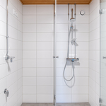 | Kylpyhuoneen kuvaus | Kylpyhuone saneerattu juuri valmistuneen taloyhtiön peruskorjausremontin yhteydessä. Seinät ja lattia laatoitettu, lattialämmitys (sähkö), puupaneelikatto, taittuvat suihkuseinät, suihku, peilikaappi, allas ja -kaappi, wc, bidesuihku, pesukoneliitäntä (tilavaraus pesutornille), kiinteät valaisimet, pyyhekoukut. |