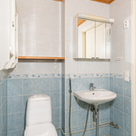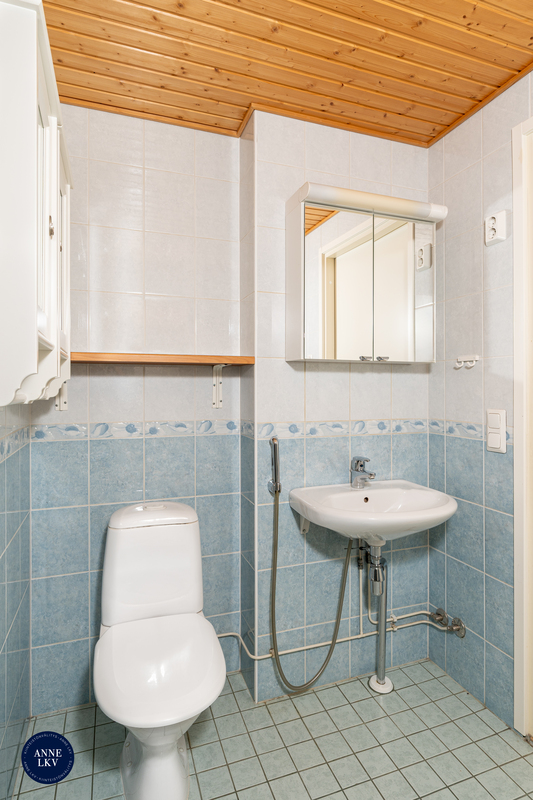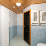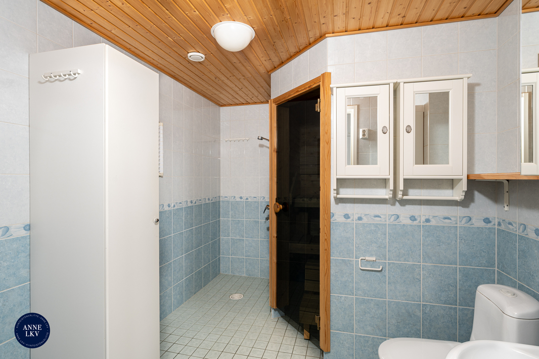 | Kylpyhuoneen kuvaus | Seinät ja lattia laatoitettu, puupaneelikatto, peilikaappi, lavuaari, wc, bidesuihku, hylly ja kaksi yläkaappia, korkea pyykkikaappi, tilavaraus pesutornille/pesukoneliitäntä, oskarinoksa, suihku, mukavuuslattialämmitys (sähkö), pyyhekoukut, lasiovi saunaan. |