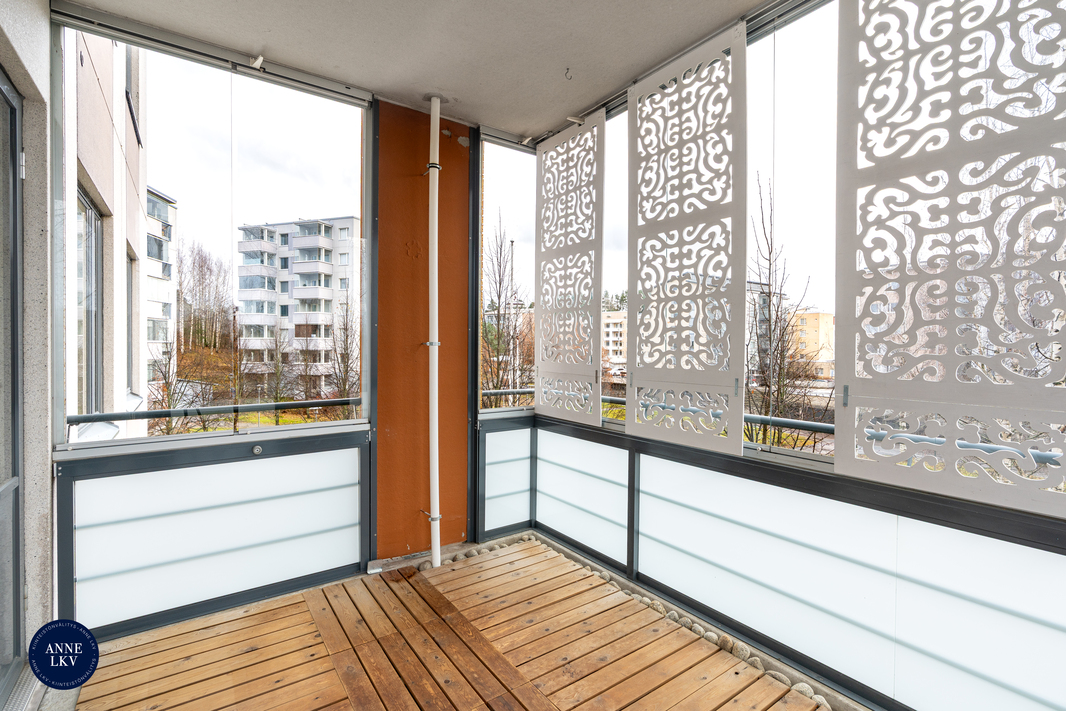 Erinomaisella rauhallisella sijainnilla Haiharankankaan puistoalueen välittömässä läheisyydessä Haiharan Helmen kolmannen kerroksen huoneisto. Olohuone on avara ja yhteydessä ruokailutilaan. Lähes vuoden ympäri oleskelutilan jatkeena toimii tilava n. 8,5 m2 lasitettu eteläparveke, josta aukeaa näkymää puistoalueelle ja pihapiiriin. U-mallinen keittiö on uskomattoman käyttäjäystävällinen - kaikki on helposti käden ulottuvilla. Makuuhuoneesta on käynti vaatehuoneeseen. Kylpyhuoneessa on tilava erillinen suihkunurkkaus, tilavaraus pesutornille ja pyykkikaappi. Oman saunan lämmöstä voit nauttia juuri silloin kun itsellesi parhaiten sopii.