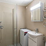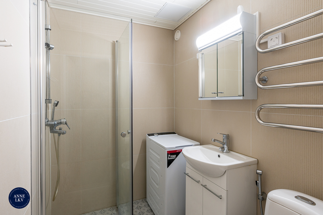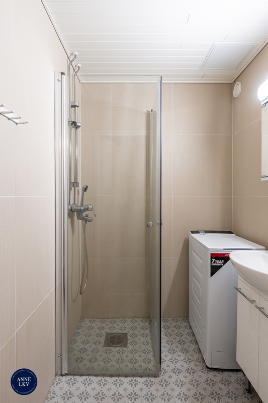 | Kylpyhuoneen kuvaus | Kylpyhuone täydellisesti remontoitu 2024. Seinät ja lattia laatoitettu, valkoinen paneelikatto, suihku, taittuvat suihkuseinät, pesukoneliitäntä (tilavaraus pesutornille), peilikaappi, allas ja -kaappi, krominen pyyhekuivain (lämpimässä käyttävedessä), bidesuihku, wc, pyyhekoukut. |