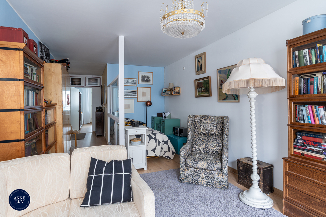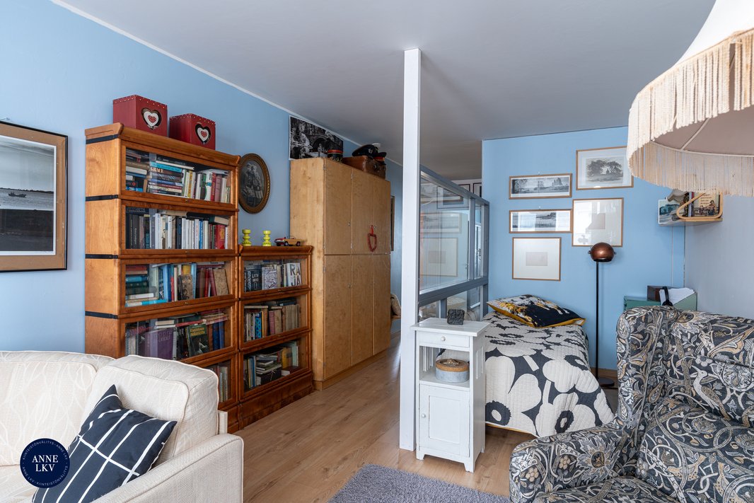 Asunnon pohjaratkaisu on joustava ja palvelee monenlaisia elämäntilanteita. Olohuoneesta on helposti erotettavissa erillinen työ- tai makuutila; tällä hetkellä tila on rajattu kätevästi seinäkkeellä. Varsinainen makuuhuone on niin ikään reilun kokoinen ja mahdollistaa vaivattomasti myös etätyöpisteen sijoittamisen. Tilaa on runsaasti niin oleskeluun kuin työskentelyyn.
