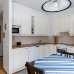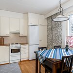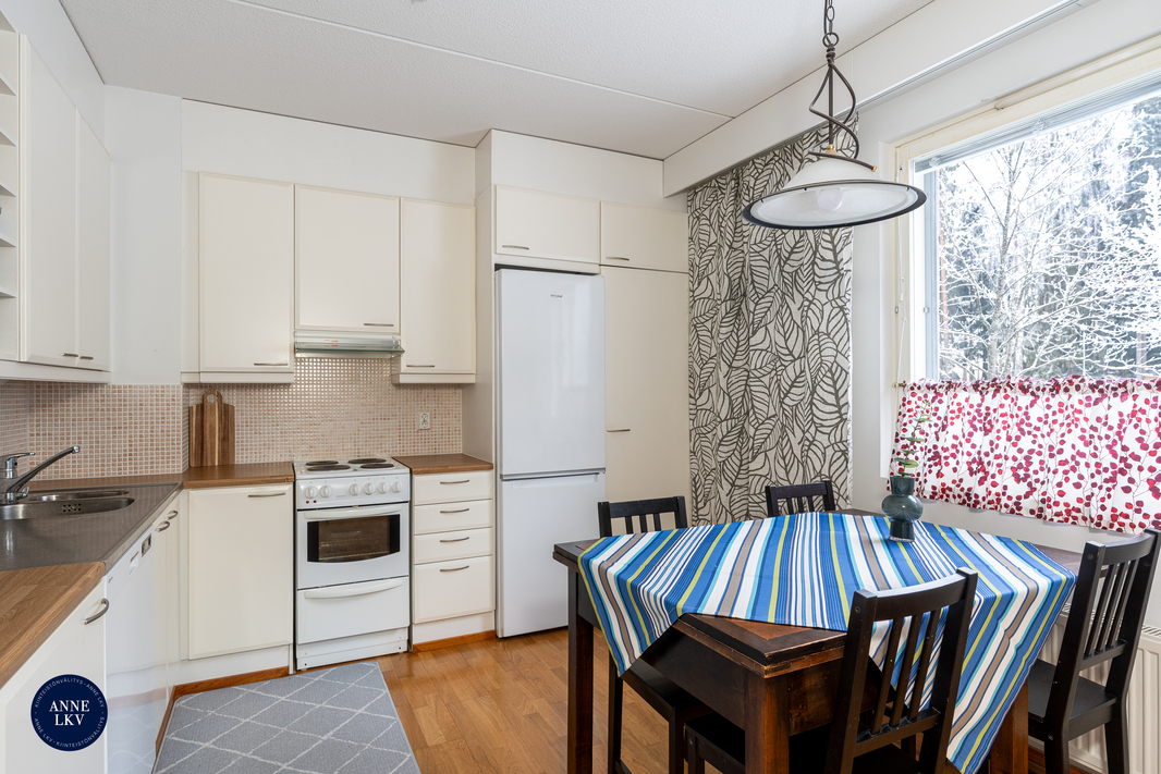 | Keittiön varustelu | Valkoiset keittiökaapit, jääkaappi/pakastinkaappi, astianpesukone, sähköliesi, liesikupu, välitila laatoitettu, laminaattitasot, seinäpinnat maalattu, parkettilattia. Tilava keittiö, jossa hyvin tilaa isollekin ruokaryhmälle. |