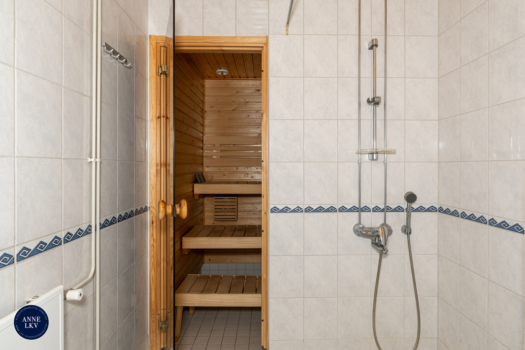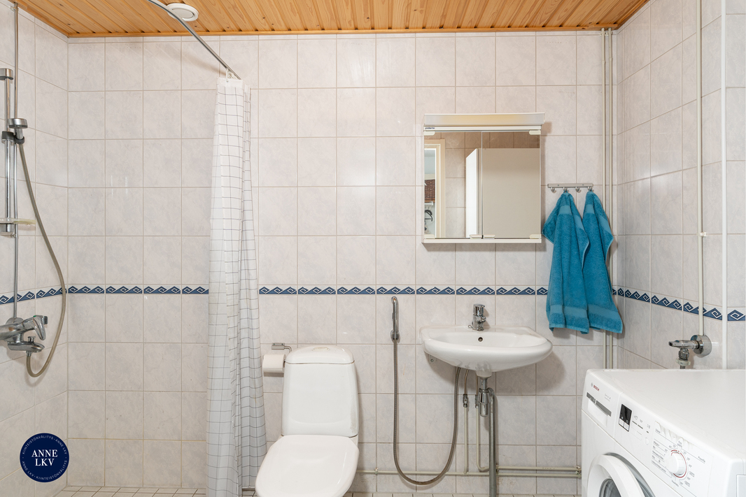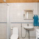 | Kylpyhuoneen kuvaus | Seinät ja lattia laatoitettu, puupaneelikatto, lattialämmitys (sähkö), lämpöpatteri, pyykkikaappi, pesukoneliitäntä (tilavaraus pesutornille), lavuaari, peilikaappi, bidesuihku, wc, suihku, suihkuverhotanko, pyyhekoukut. |