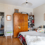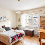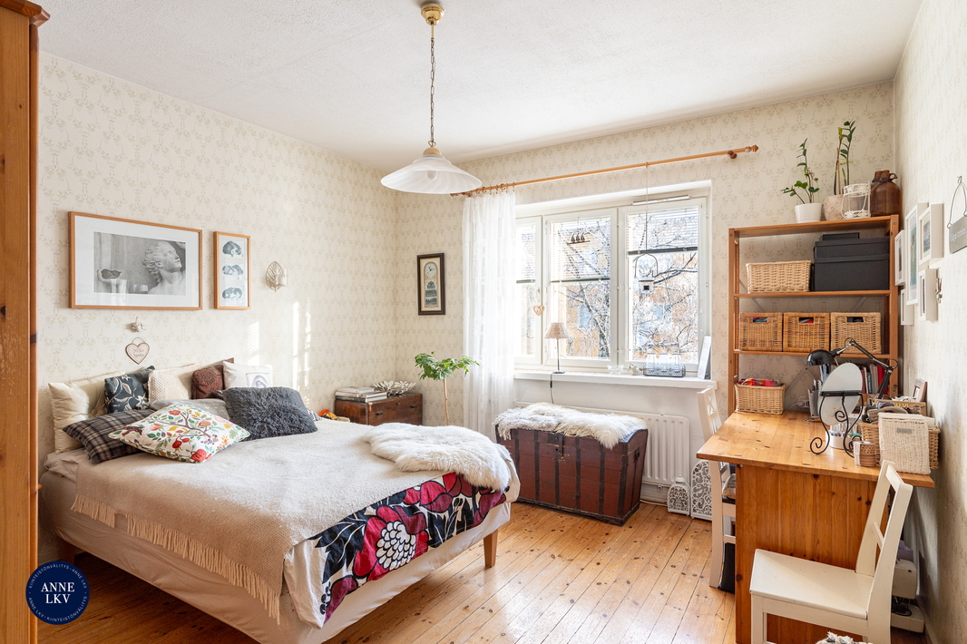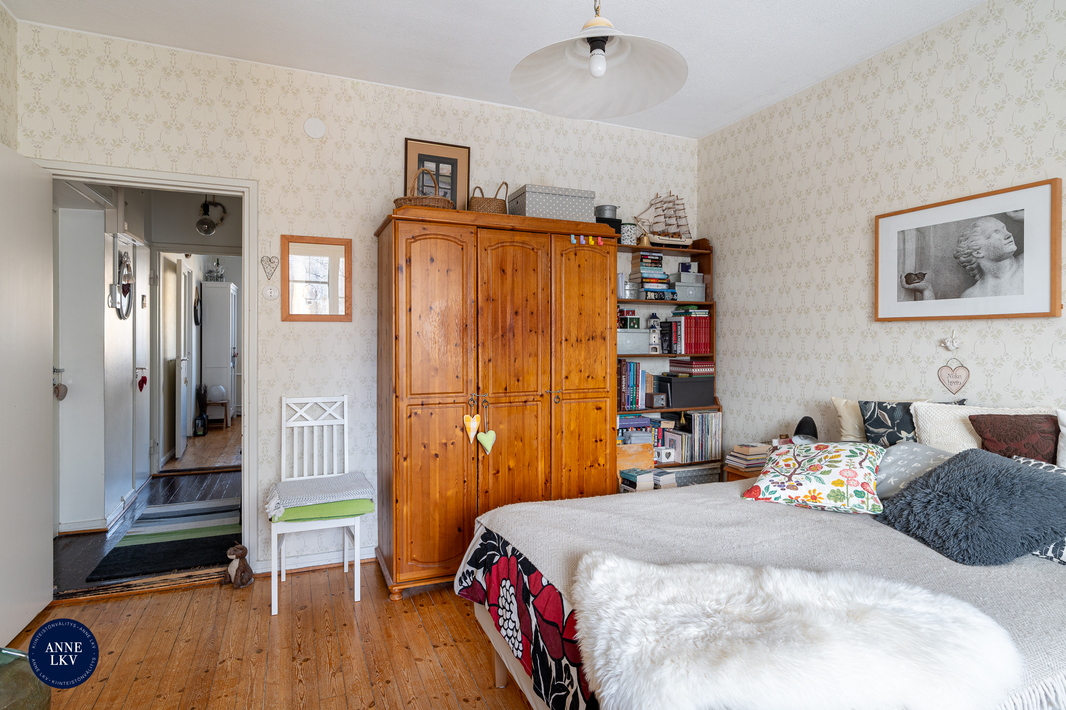 | Makuuhuoneen kuvaus | Upean iso makuuhuone, josta ikkunanäkymä taloyhtiön puistopihalle. Suunta itä. Seinäpinnat tapetoitu ja lattiassa alkuperäinen puulattia. |