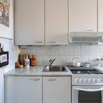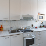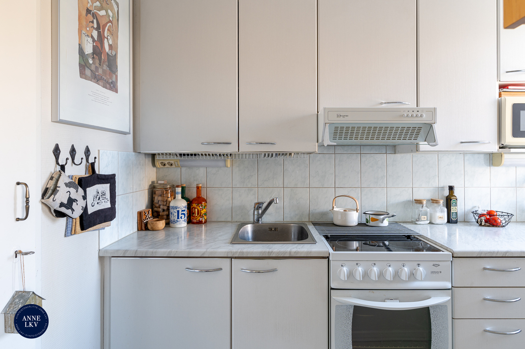 | Keittiön varustelu | Vaaleanharmaat keittiökaapit, keraaminen liesi, liesituuletin (suodatin), jääkaappi/pakastinkaappi (2024), laminaattitasot, välitila laatoitettu, kiinteät valaisimet, seinäpinnat maalattu, muovimatto lattiassa, komero. Keittokomerossa lisäksi ikkuna, joka tuo tilaan hyvin valoa. |
