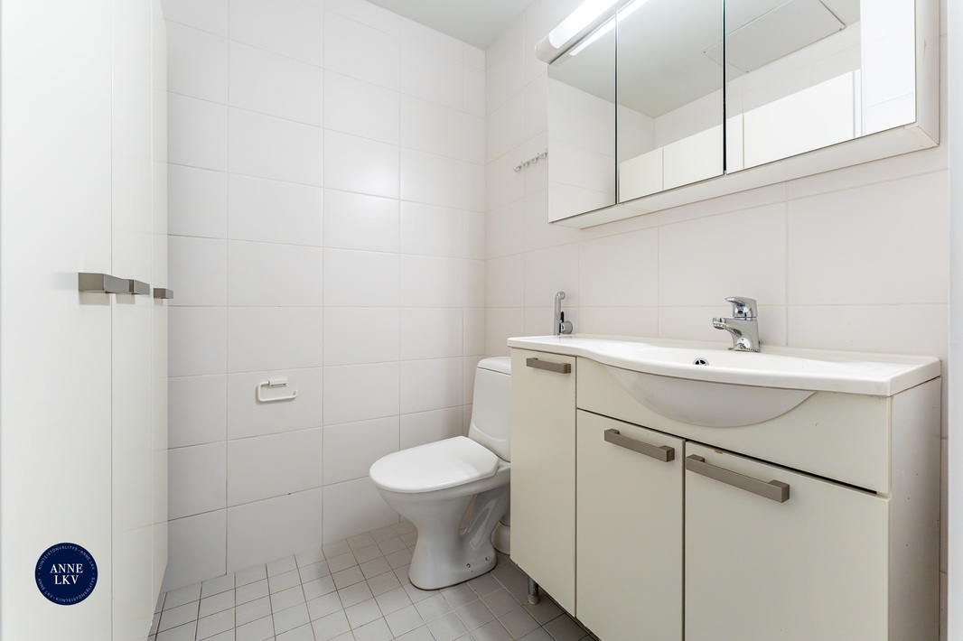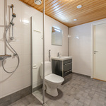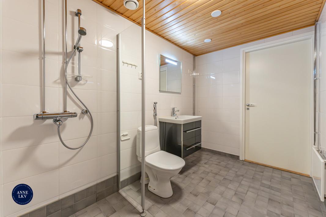 | Kylpyhuoneen kuvaus | Seinät ja lattia laatoitettu, lattialämmitys (sähkö), puupaneelikatto, pesukoneliitäntä (tilavaraus pesutornille), allas ja -laatikosto (2020), valopeili, wc, bidesuihku, lasisuihkuseinä, suihku, lämpöpatteri, pyyhekoukut. |