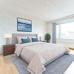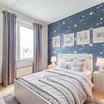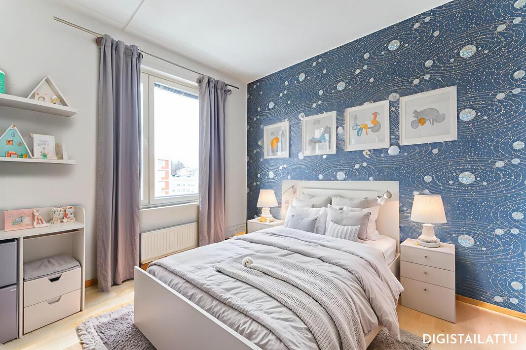| Makuuhuoneen kuvaus | Kolme makuuhuonetta, joiden ikkunanäkymät avautuvat etelän suuntaan. Isosta makuuhuoneesta käynti vaatehuoneeseen. Keskimmäisessä makuuhuoneessa seinän mitalta korkeat kaapit sekä huoneen ja eteistilan väliseinässä pitkä vaakasuuntainen yläikkuna. Makuuhuoneissa seinäpinnat maali/tapetti ja parkettilattiat. |